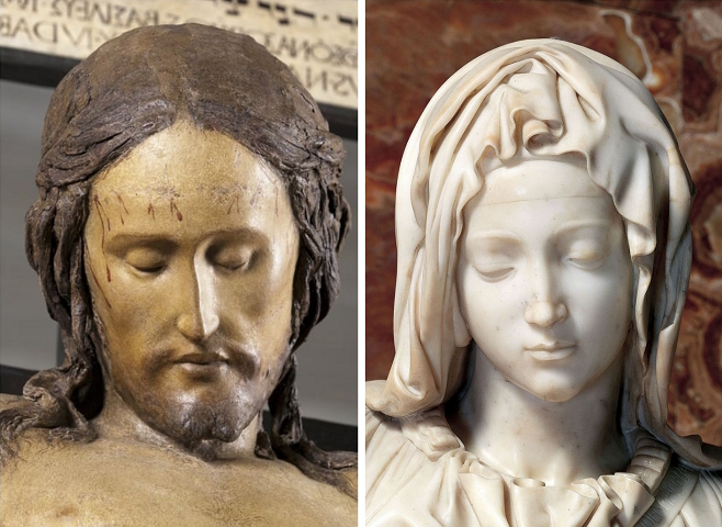 Il rapporto tra questo genio universale e la realtà in questione è molto evidente nei volti di Maria nella Pietà Vaticana e di Cristo nel Crocifisso di Santo Spirito: l’apparente somiglianza dei due volti richiama l’attenzione e colpisce soprattutto in relazione alle numerose versioni alternative di Michelangelo dei due personaggi. Anche la linea orizzontale “punteggiata” dei segni della corona di spine sulla fronte di Gesù è riprodotta nella forma del bordo della cuffia del velo sulla fronte della Vergine. La somiglianza è stata notata anche dalla scopritrice e restauratrice del crocifisso, la dottoressa Margrit Lisner – storica dell’arte e prima donna docente all’Università di Friburgo, in Germania – che ha fatto delle osservazioni su alcuni punti di somiglianza, come la delicata definizione del naso e l’espressione di solennità in entrambi i volti.