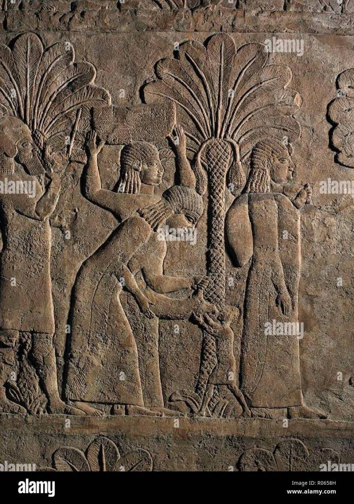 Rilievo del pannello murale in gesso: formato da tre registri. La scena mostra i prigionieri guidati dai soldati attraverso boschetti di palme da dattero accompagnati da famiglie e beni. Manca il terzo superiore del registro superiore. Si tratta del periodo degli assiri, donna e bambino, ma come mai gli adulti sono alti quanto le palme da datteri?